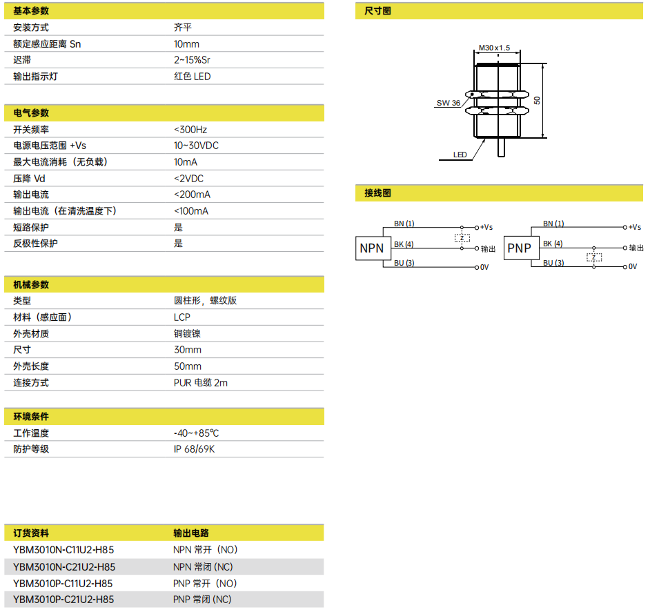 Sn = 10mm ■ 坚固的外壳 ■ IP69K 防护等级 ■ 工作温度 :-40~+85℃