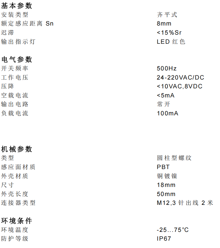 ■ M18*1mm ■ 8mm, 齐 平 式 安 装 ■ M12, 3 针 出 线 2 米
